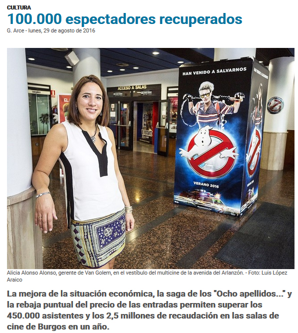 Alicia Alonso Alonso (hija de Pablo y Montse) Como gerente de Cines Van Golem nos habla en este artículo de Diario de Burgos de la recuperación de espectadores que asisten a ver películas al estilo tradicional, en una sala de cine con palomitas incluidas. Felicidades por tu buen hacer.