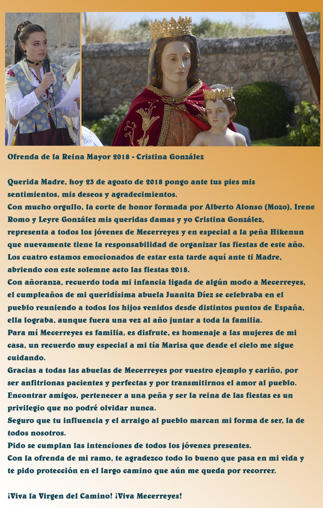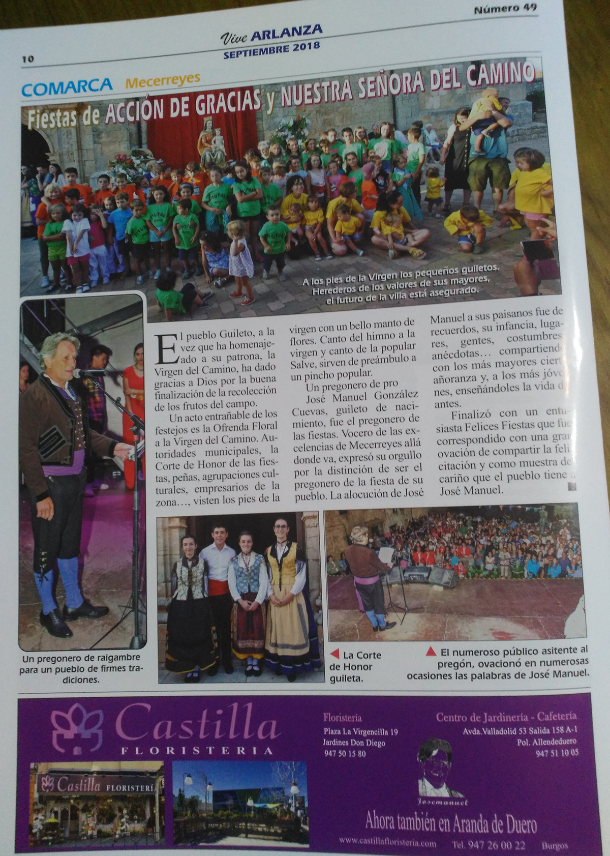 Viandas, música, peñas y marco incomparable que nos lleva a la noche donde una plaza llena espera la proclamación oficial de la corte de honor. Reina 2018 Cristina González, Damas: Leyre González e Irene Romo y Mozo 2018 Alberto Alonso. Tomaron posesión de sus bandas y capa dando paso al pregonero José Manuel González, quien de forma magistral supo encandilar a los presentes. Este acto fue grabado por Radio Evolución, y destacado en la prensa Burgalesa.