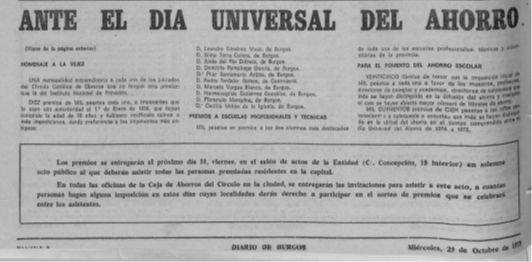 Acompaño la noticio con otra que apareció días más tarde en el Diario de Burgos, en la que se concede a Mecerreyes otro premio por parte de lo que entonces era Caja de Ahorros del Círculo Católico (Hoy en día absorbida por Ibercaja) de 20.000 pesetas por ser uno de los diez pueblos con más libretas abiertas en función de su número de habitantes. Dinero que se entrego al alcalde, para que junto con el párroco lo destinaran al bien común.