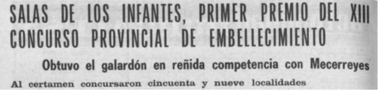 Damos este mes un salto en el tiempo hasta hace exactamente cincuenta años, pues en el mes de septiembre de 1975 se nos entregó a Mecerreyes un premio de embellecimiento por la Diputación de Burgos. Bien es cierto que fue un segundo premio y repartido entre tres puebles, pero no deja de tener su mérito, toda vez que competíamos contra Salas de los Infantes como aparece en el segundo titular, que es un pueblo (en realidad tiene la categoría de ciudad) con muchas más posibilidades que Mecerreyes.