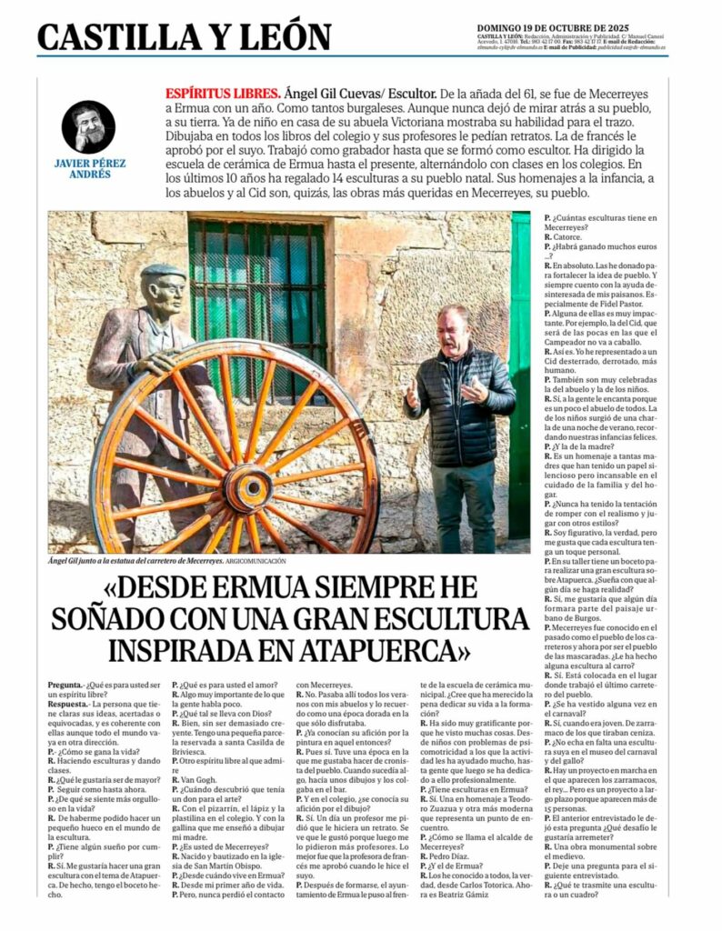La segunda entrevista, realizada a nuestro escultor: Ángel Gil Cuevas, titulada “Desde Mecerreyes siempre he soñado con una gran escultura inspirada en Atapuerca”, profundiza en la visión artística y arraigo cultural con su pueblo natal.