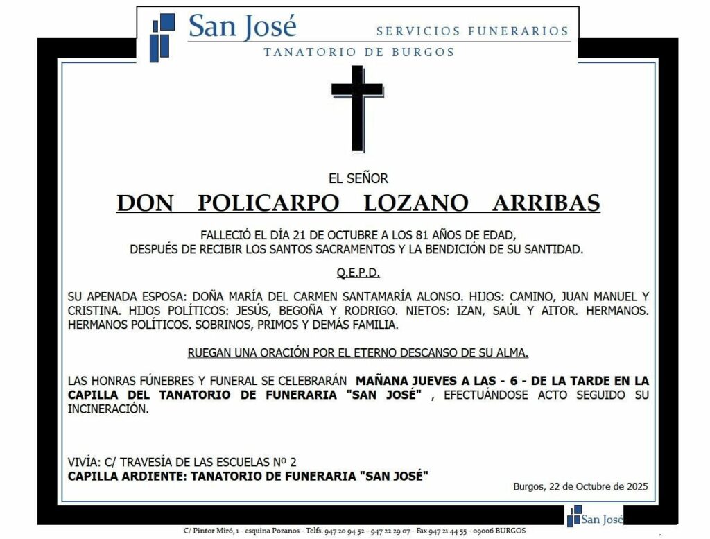D. POLICARPO LOZANO ARRIBAS falleció en Burgos el día 21 de octubre a los 81 años de edad. Al son de jota, interpretada por la Asociación de Dulzaineros de Burgos, fue despedido por su familia y amigos en la capilla del tanatorio San José. Descanse en Paz.