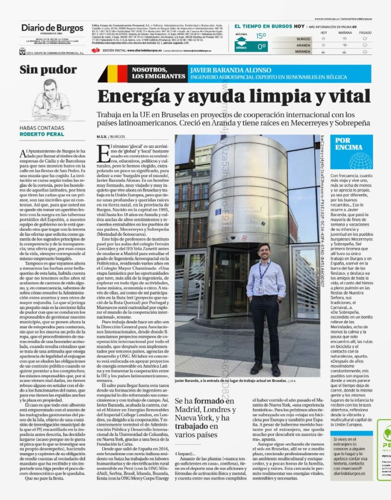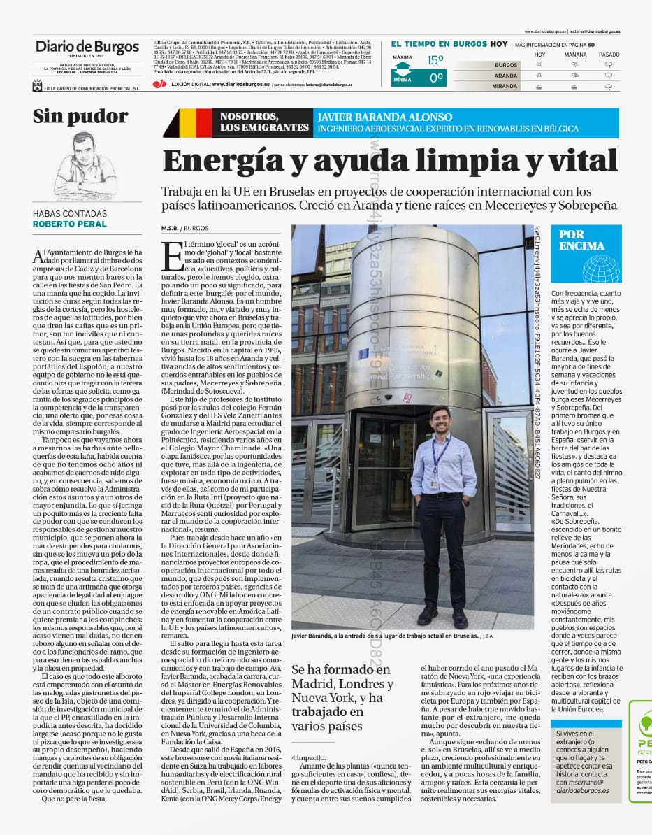 Diario de Burgos, publicaba en su sección NOSOTROS, LOS INMIGRANTES, una entrevista a Javier Baranda Alonso (hijo de Eva y Jose Luis), donde después de presentar su amplio currículum, nos cuenta lo que siente cuando vuelve a sus raíces burgalesas y lo importante que esto es en su vida.