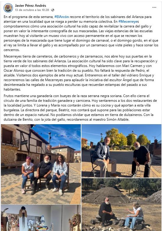 Es el caso del periodista Javier Pérez Andrés, quien pasó un día estupendo grabando los elementos etnográficos más destacados y el Museo del Carbón, de la mano de Mari Carmen Mambrillas y Oscar Alonso; el Parque Natural Sabinares del Arlanza – La Yecla, de la mano de su directora Beatriz Cabeza; la ruta de esculturas de gran formato de Ángel Gil; el taller de Enrique Barrio; la ganadería de Frutos Alonso; a María Jesús y Lorena regentes del Bar La Villa y Mesón de Frutos; el testimonio del alcalde Pedro Alonso y el toque musical de Benito y Jesús.