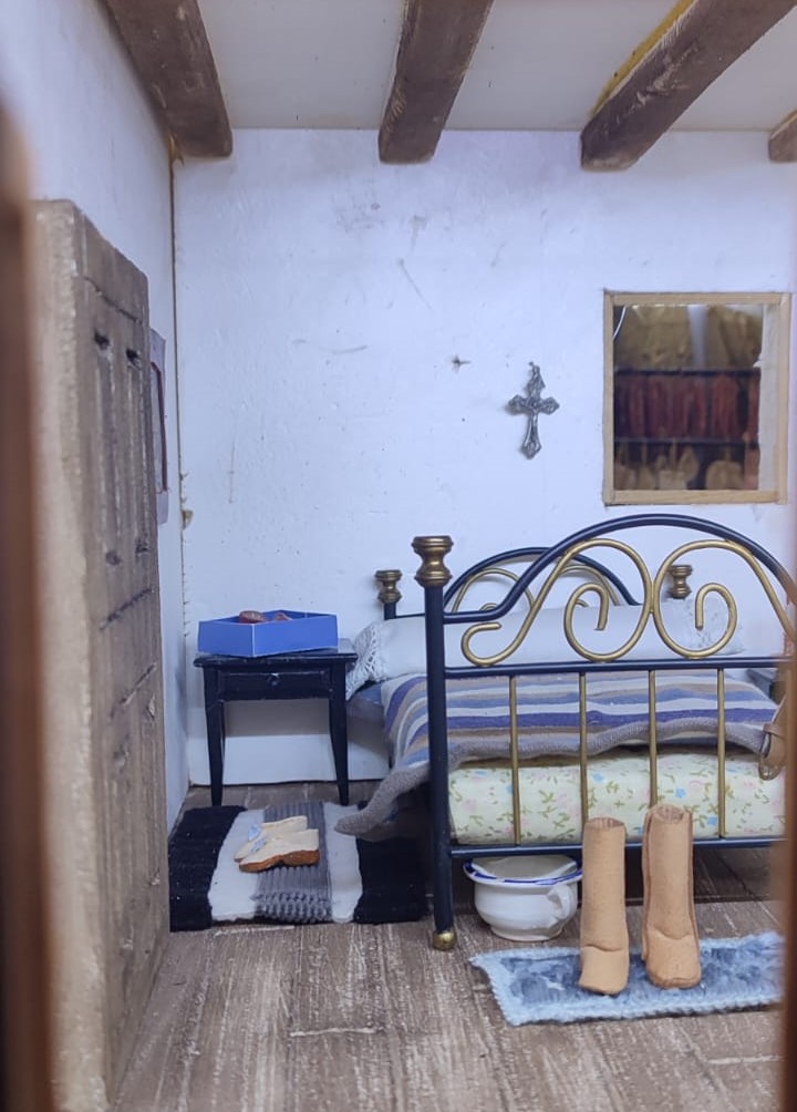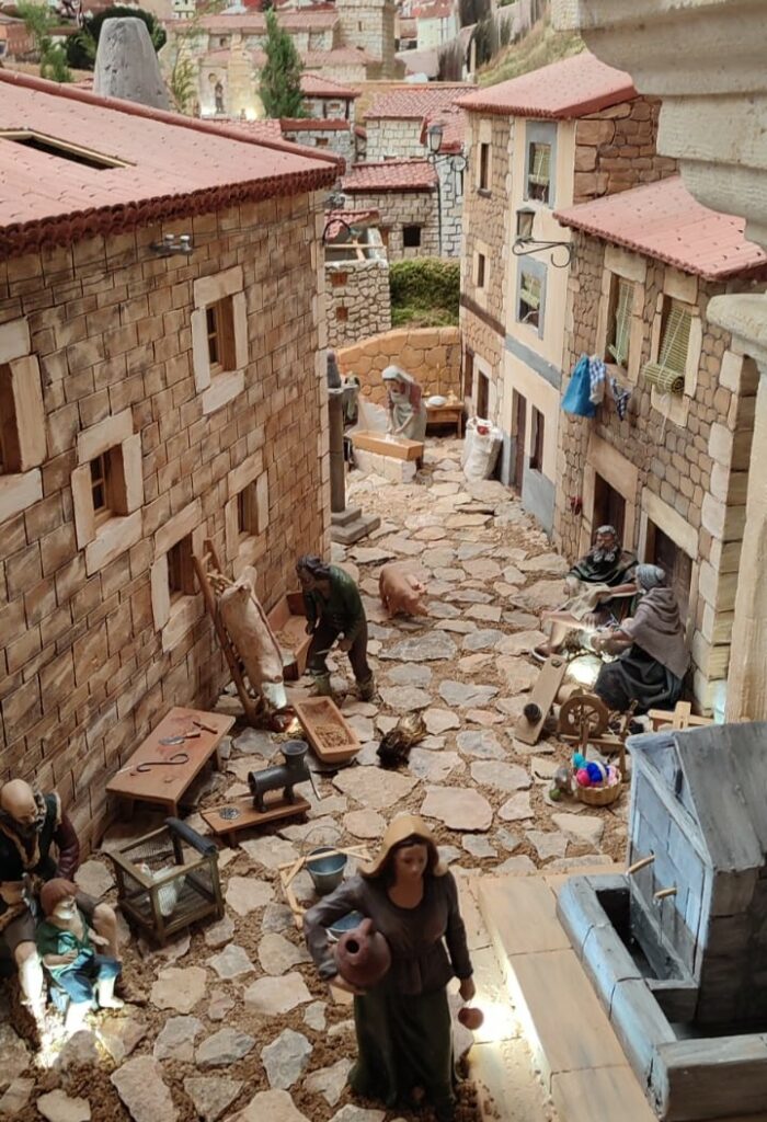 • La fuente del «tío Robustiano» y sigue el pueblo por la estrecha calle: la matanza del cerdo, una hilandera devanando la rueca y al fondo, la panadera amasando el pan.