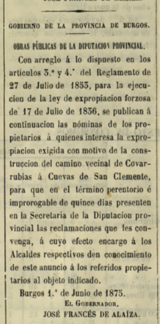 Continuamos este mes con el tema de la carretera de Covarrubias a Cuevas de San Clemente. Ahora se publican las fincas afectas a expropiación forzosa para que sus titulares presenten las reclamaciones que consideren oportunas.