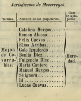 En total son 222 propietarios, que si los repartimos entre los aproximadamente cinco Kilómetros que van desde la raya de Covarrubias a la de Cuevas (Exceptuando el casco urbano), nos da fincas de unos 22 metros de media, algo que está en consonancia con el tipo de las fincas que había antes de que se hiciera la concentración parcelaria en los años 60 del siglo XX.