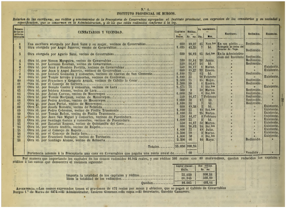 Traemos este mes una noticia que afecta solo tangencialmente a Mecerreyes. Se trata de las cuentas que presenta el Instituto Provincial de Burgos, (Lo que actualmente conocemos como Instituto de Enseñanza Secundaria “López de Mendoza”. Los ingresos de un Instituto de la época consistían básicamente en las matrículas que pagaban los alumnos y donaciones y rentas que recibían de determinados donantes. En este apartado aparecen determinados escrituras de censos de la preceptoría de Covarrubias, que probablemente algún clérigo en su momento donó al Instituto o más probablemente a su antecesor (y el Instituto lo heredo).