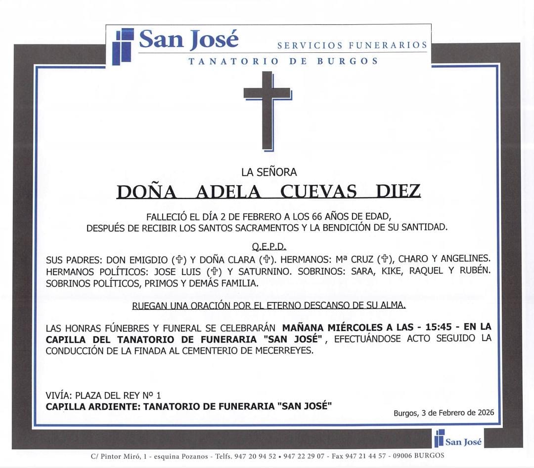 DÑA. ADELA CUEVAS DIEZ falleció en Burgos el día 2 de febrero a los 66 años de edad. La tarde del día 3, después de despedir sus restos en la capilla del tanatorio de San José fueron trasladados hasta el cementerio de Mecerreyes. Descanse en Paz.