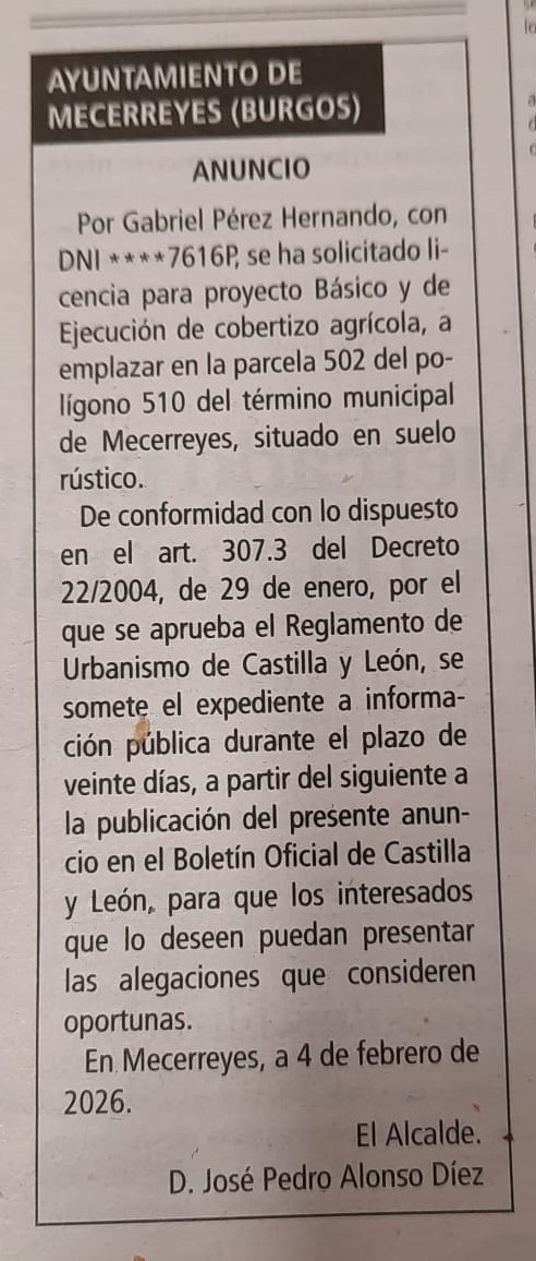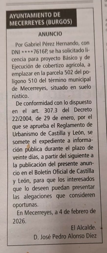 Nos hacemos eco del recorte en prensa como información pública de la solicitud de licencia para hacer un cobertizo agrícola en la parcela 502 del polígono 510.
