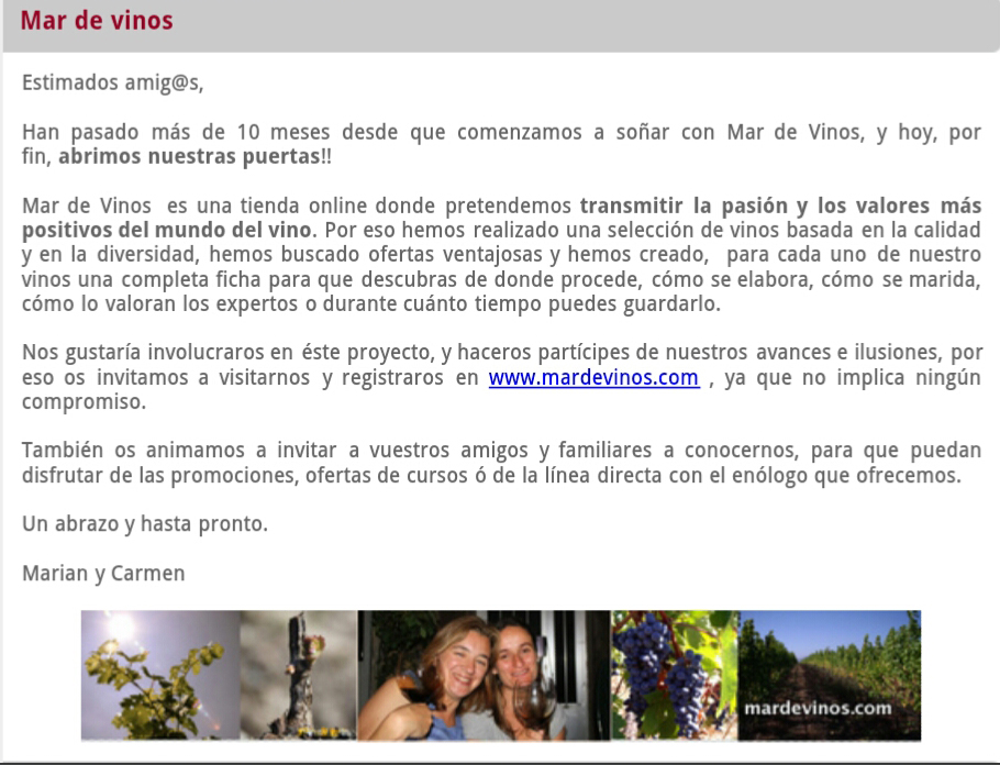 Y de esto queremos hablaros hoy, de dos guiletas: Marian (hija de Abel+ y Vitoria) y Carmen (hija de Carmen+ y Máximo+), “dos profesionales que con una dilatada experiencia en el sector vinícola y en la gestión empresarial…” Han abierto una tienda online www.mardevinos.com “para poner a disposición de nuestros clientes una oferta representativa de la increíble variedad enológica de España y otros países productores” – cuentan ellas mismas.
