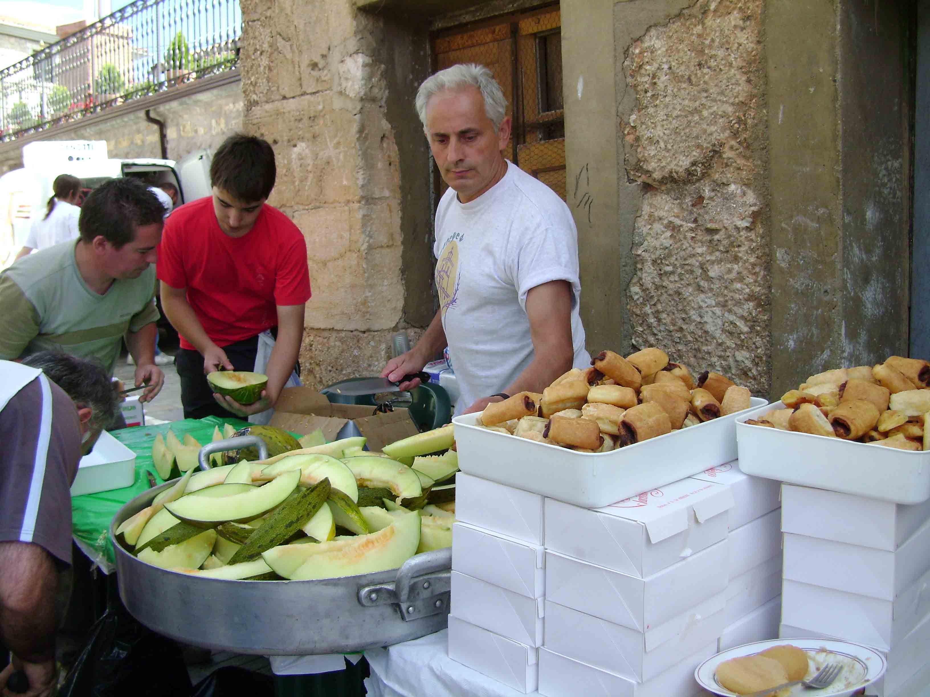 Por segundo año pudimos celebrar un acto de hermandad; el sábado 5 de Septiembre Segun y algún valiente más elaboraron un suculento plato de cordero con patatas y todos pudimos disfrutar de una CALDERETA estupenda. Nuestro agradecimiento para Javi y su familia por este detalle con todo el pueblo, a Segun y sus colaboradores peladores de patatas por la labor callada pero fundamental preparando las perolas inmensas de carne, al Ayuntamiento y a todos los que colaboraron poniendo mesas, sirviendo, etc. Nos juntamos 190 personas, que gracias al buen tiempo, degustamos el plato de la caldereta y del postre de melón, helado y almendras. También el Mesón de Frutos obsequió a los asistentes que lo desearon con chupitos “para hacer mejor la digestión”. No faltaron las canciones de siempre muy bien animadas por Maite, Jacinto y Jesús “el Botas”, así como por todos los asistentes que hacían los coros.