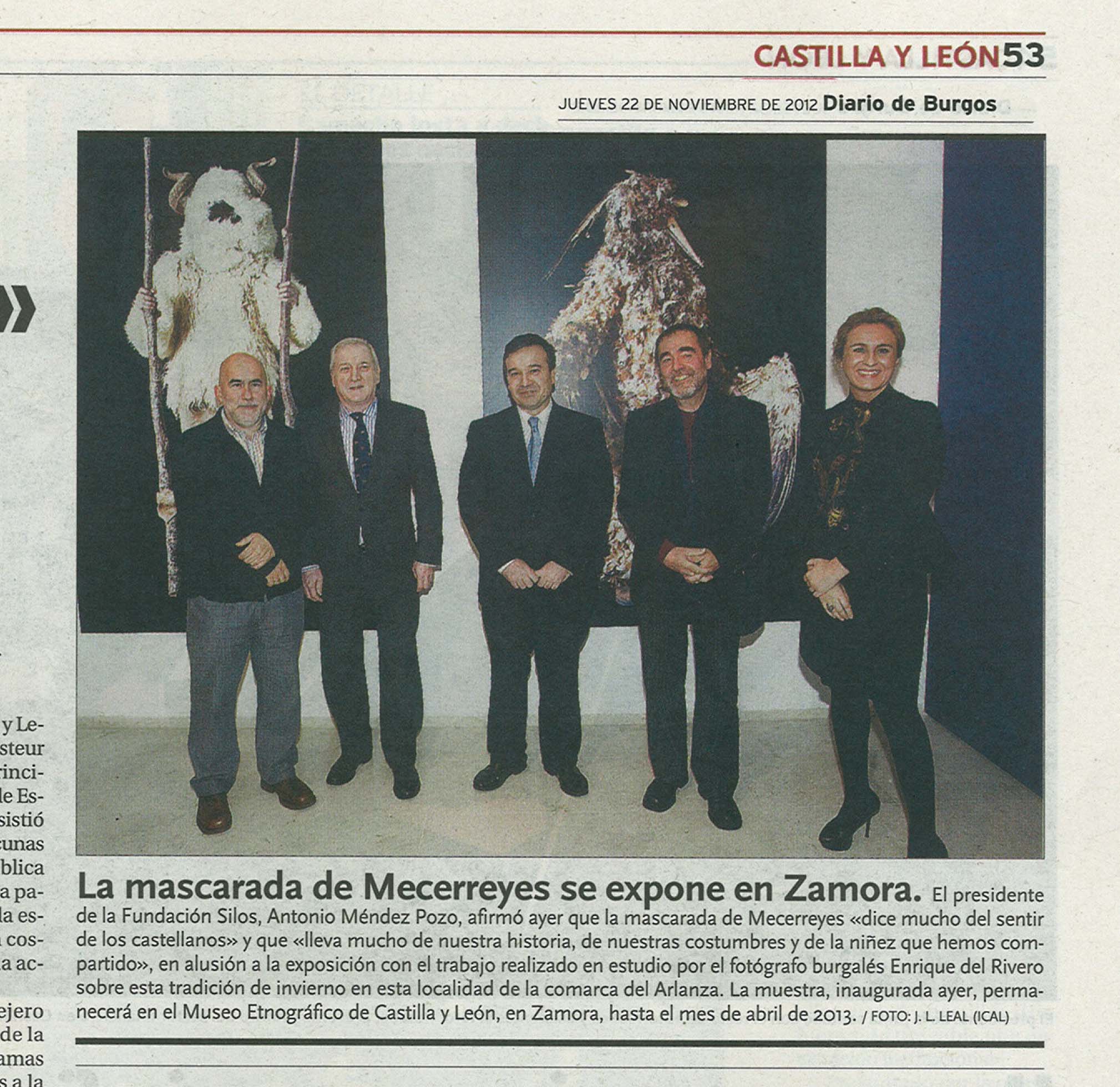 El “Espíritu de invierno – Mascaradas de Mecerreyes” va más allá de nuestras fronteras provinciales. Después del éxito cosechado en su estancia en Silos, esta muestra de fotos de Enrique del Rivero, recala en el Museo Etnográfico de Zamora. Se inauguró la exposición el miércoles 21 de noviembre y que se puede visitar hasta abril de 2013. Julián como alcalde estuvo representándonos a todos en el acto inaugural junto a otras autoridades regionales y del mundo de la cultura. La noticia salió publicada en varios medios de comunicación -que puedes leer en esta página-; también puedes ver el cartel de la exposición.
